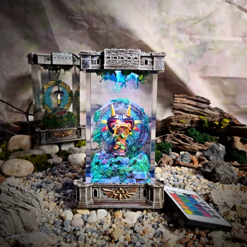 To elevate a Majora’s Mask display, the Zelda Majora’s Mask Lamp from Grizz Studio is an ideal companion. Priced between £65.00 and £135.00, this handmade lamp is available in three sizes: small (2.76 x 5.51 x 2.76 inches), medium (6.3 x 3.5 x 3.5 inches), and large (7.9 x 4.7 x 4.7 inches). It features a vibrant green glow, a charging cable, and a remote control for color adjustments, allowing customization to suit any decor.