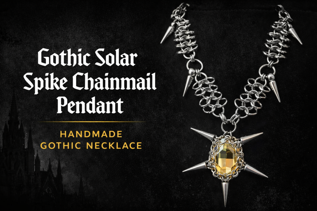 The Gothic Solar Spike Chainmail Pendant from Grizz Studio is a captivating necklace that fuses medieval armor aesthetics with modern punk rebellion. This entirely handmade piece draws inspiration from dark gothic traditions and fantasy worlds, featuring a radiant citrine-style gemstone surrounded by interlocking chainmail and dramatic outward-radiating spikes. It’s perfect for gothic fashion lovers, alternative style enthusiasts, punk and metal fans, and collectors of unique, edgy jewelry who want an accessory that commands attention and reflects their individualistic spirit.