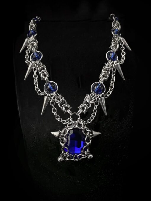 What sets this necklace apart is its artisan touch. The blue crystal stone is handmade, and the entire piece carries the spirit of careful, individual creation. This artisan handmade necklace isn’t mass-produced—each element, from the woven chainmail to the precisely placed spikes, reflects dedication to quality and detail.