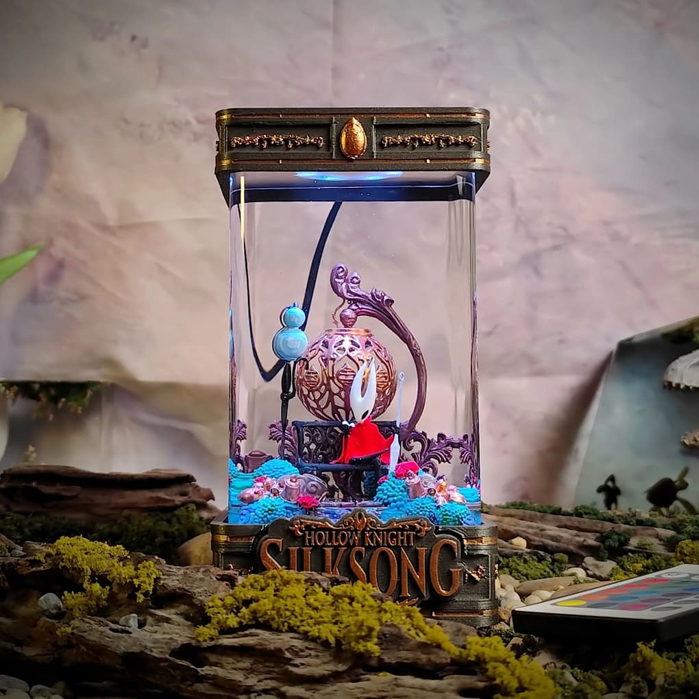 Grizz Studio proudly unveils three exclusive, fully handcrafted resin art lamps inspired by the long-awaited masterpiece, Hollow Knight: Silksong. Each piece is a one-of-a-kind fusion of intricate miniature sculpting, crystal-clear premium epoxy resin, and immersive multicolor LED lighting that brings the mysterious kingdom of Pharloom right into your home.