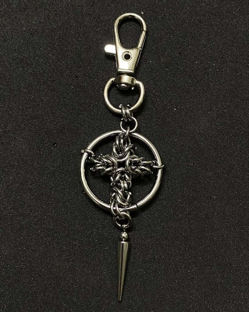 A circle holds a cross—two shapes steeped in centuries of symbolism. Here, the cross is woven from stainless steel rings inside a round frame, suggesting not only spiritual echoes but also balance, cycle, and enduring strength. Below it swings a polished spike, a sharp accent that gives the symbol a modern, gothic twist.