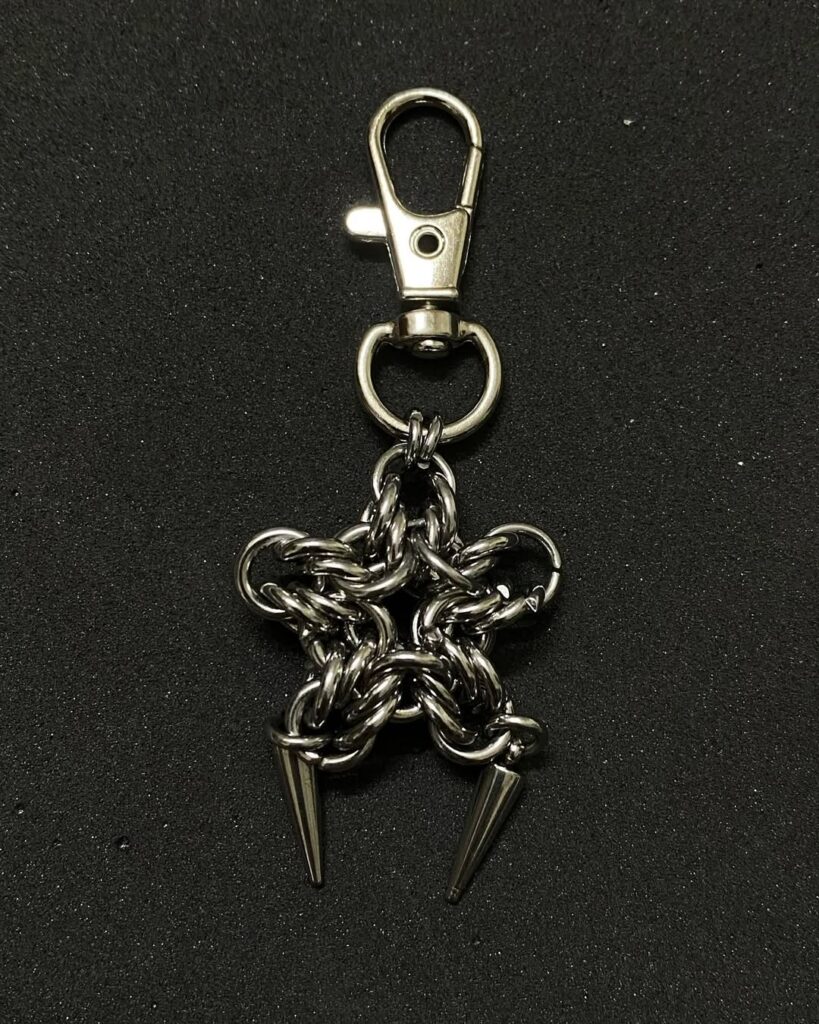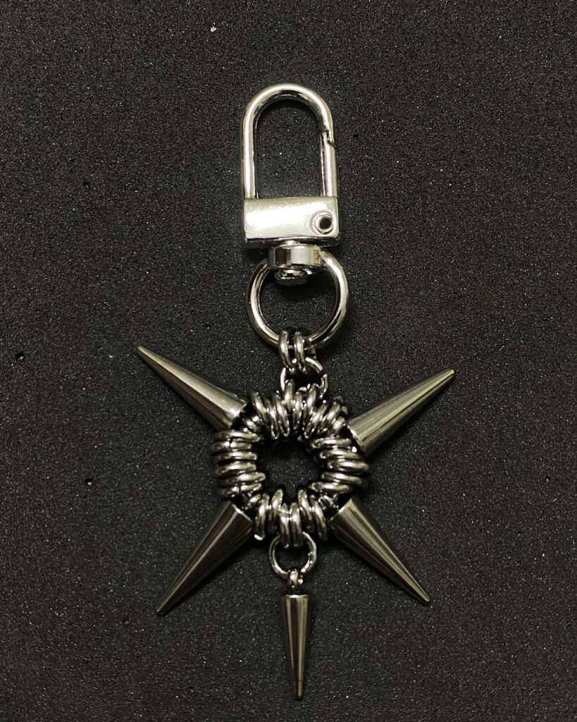 At first glance this keychain is a burst of steel spikes, but look closer and you’ll see the heart: a ring of many tiny links, crafted like a miniature wreath of armor. From that ring extend four long spikes, forming a star that radiates power and rebellion. Beneath, a single spike dangles—adding motion, contrast, and a whisper of sharpness.