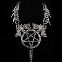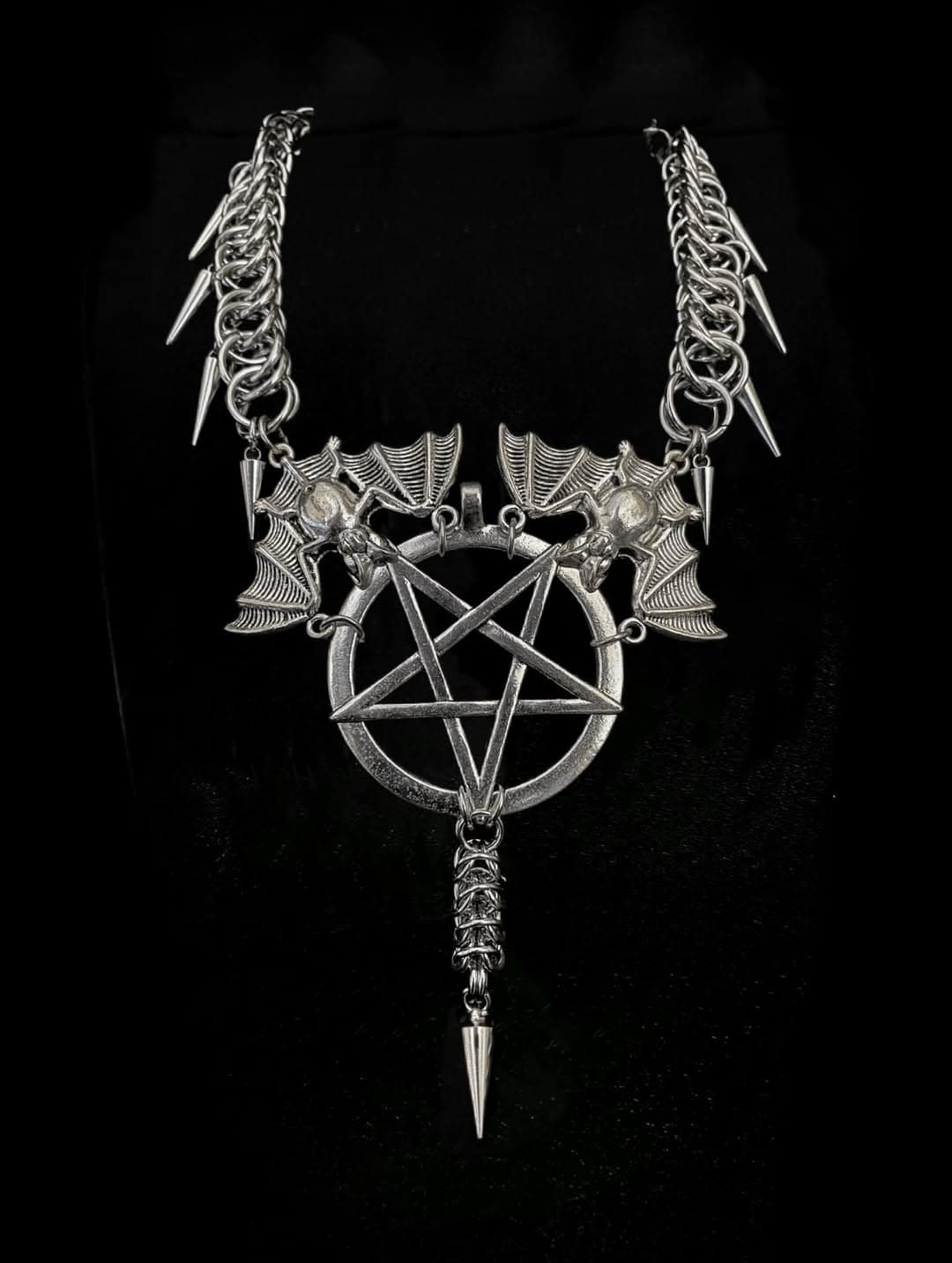 The design draws inspiration from medieval armor, industrial mechanics, and gothic fashion culture—translated into a wearable statement that balances aggression and refinement. The weighted construction gives the necklace a powerful presence, while the adjustable clasp ensures comfort and versatility for different styling choices.
