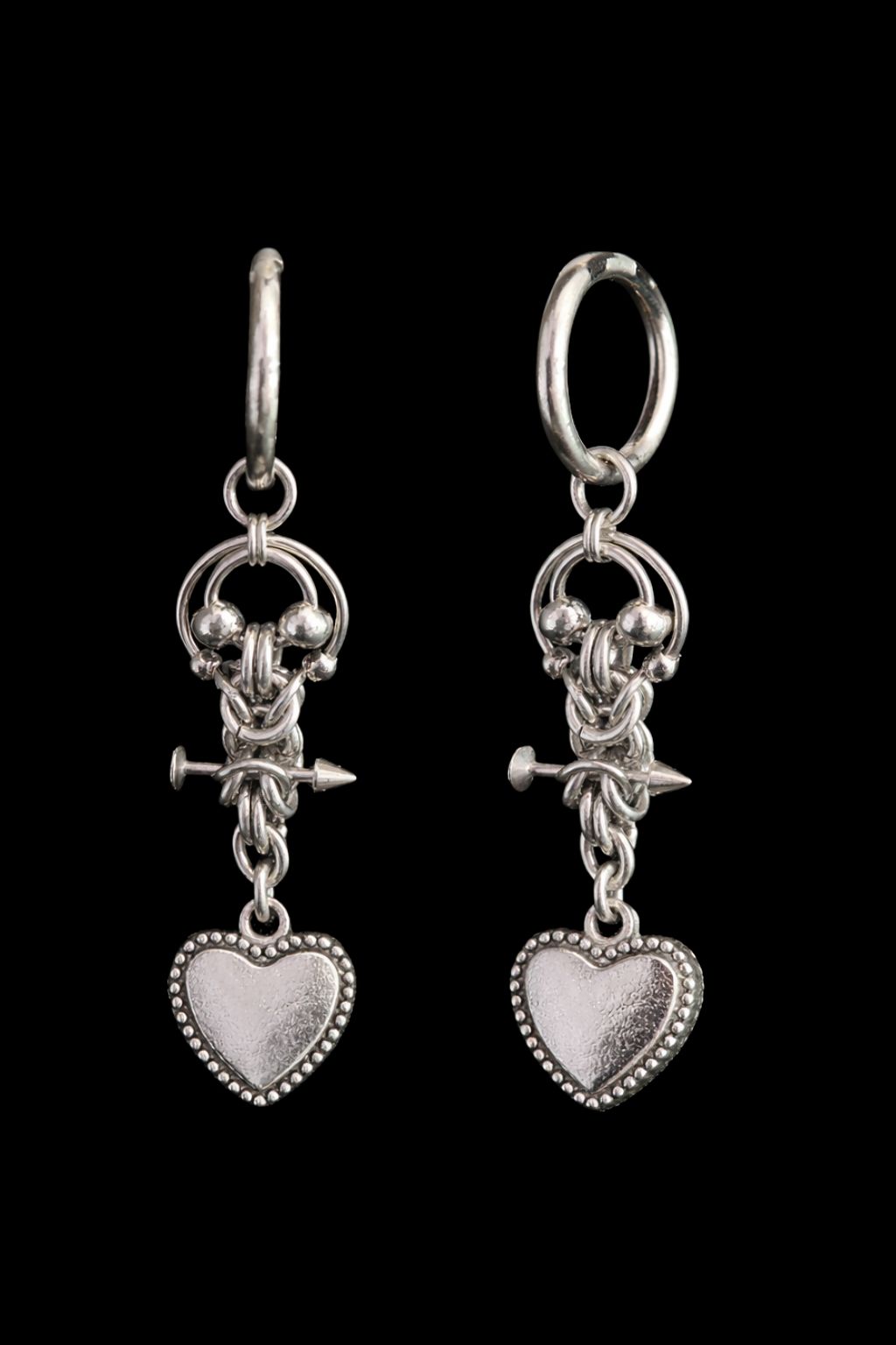 Built from interlinked metal rings and finished with a functional toggle-style detail, this earring delivers both visual movement and tactile depth. The suspended heart charm features a textured surface and beaded edge, adding subtle contrast to the clean metallic geometry above it.