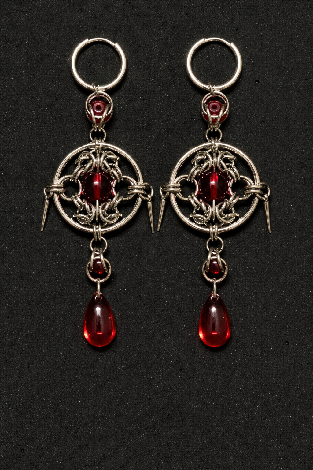 Each earring features an intricate chainmaille sigil circle, forged from polished metal rings and anchored by a deep blood-red glass bead, evoking ancient gothic rituals and forbidden magic.