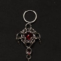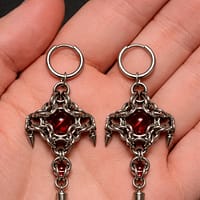 Handcrafted with precision, the Crimson Core Chainmail Earring with Industrial Spikes features a striking red glass core suspended within an intricate stainless steel chainmail structure. The geometric weave creates a balanced, armored silhouette, enhanced by polished spike accents that add a sharp industrial edge.