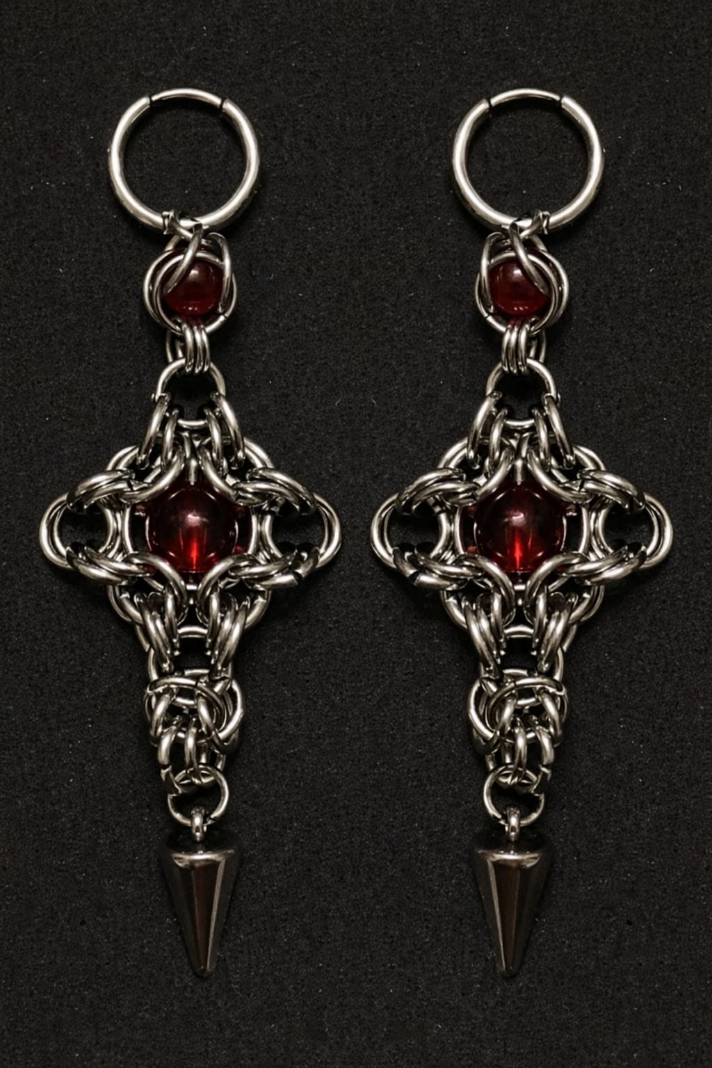 Interlinked stainless steel rings create a symmetrical sigil-like silhouette, centered with deep crimson glass beads that catch light subtly without overpowering the design. The pointed metal drop adds weight and movement, giving the earring a strong visual presence while remaining wearable for daily styling or alternative fashion looks.