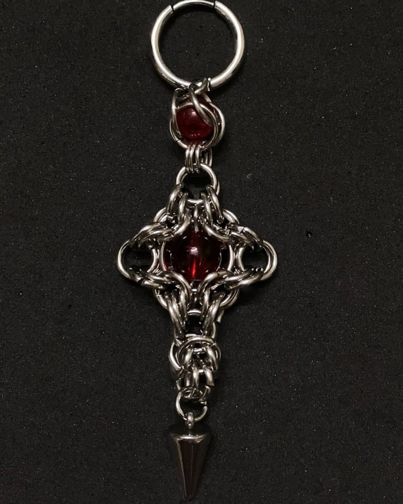 This handcrafted chainmail drop earring is built around a bold geometric structure inspired by industrial metal forms and dark fantasy aesthetics.