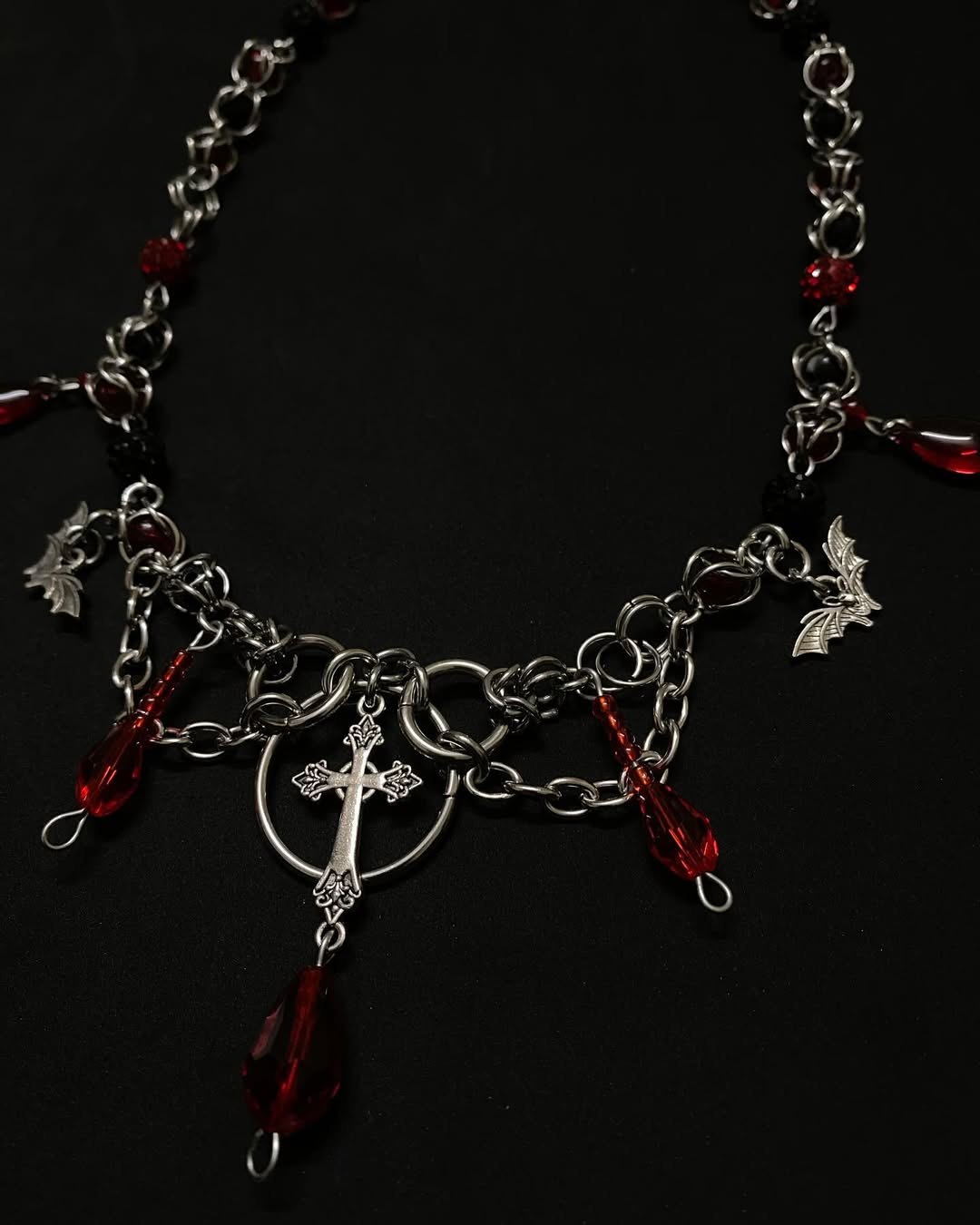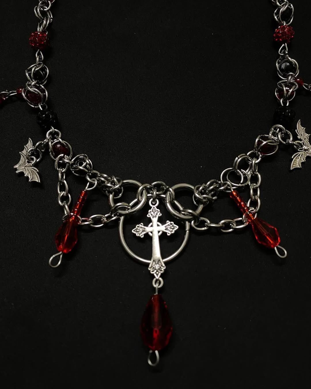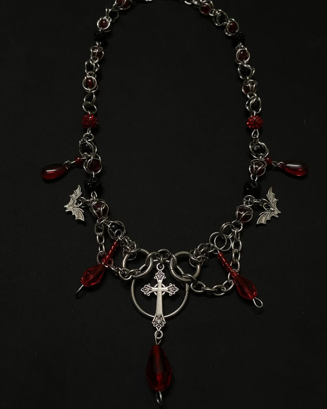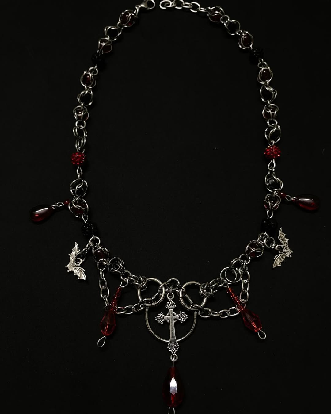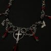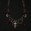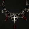 Dark Gothic Cross Necklace with Red Crystal Beads