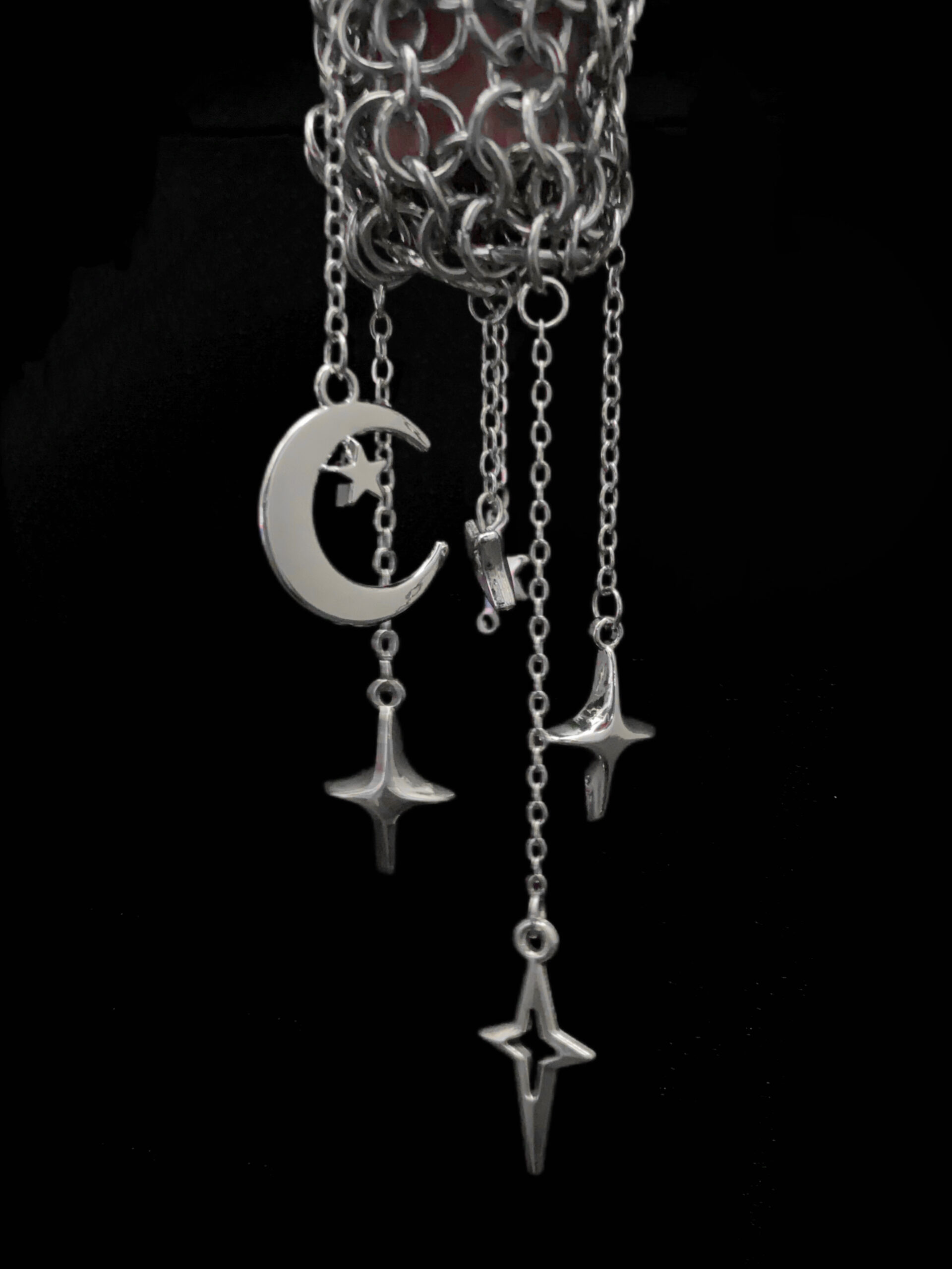 Hanging moon and star charms add movement and ritual symbolism, giving the piece a celestial, romantic gothic character. Each chain link is carefully assembled to ensure durability, flexibility, and a refined finish.