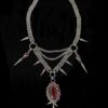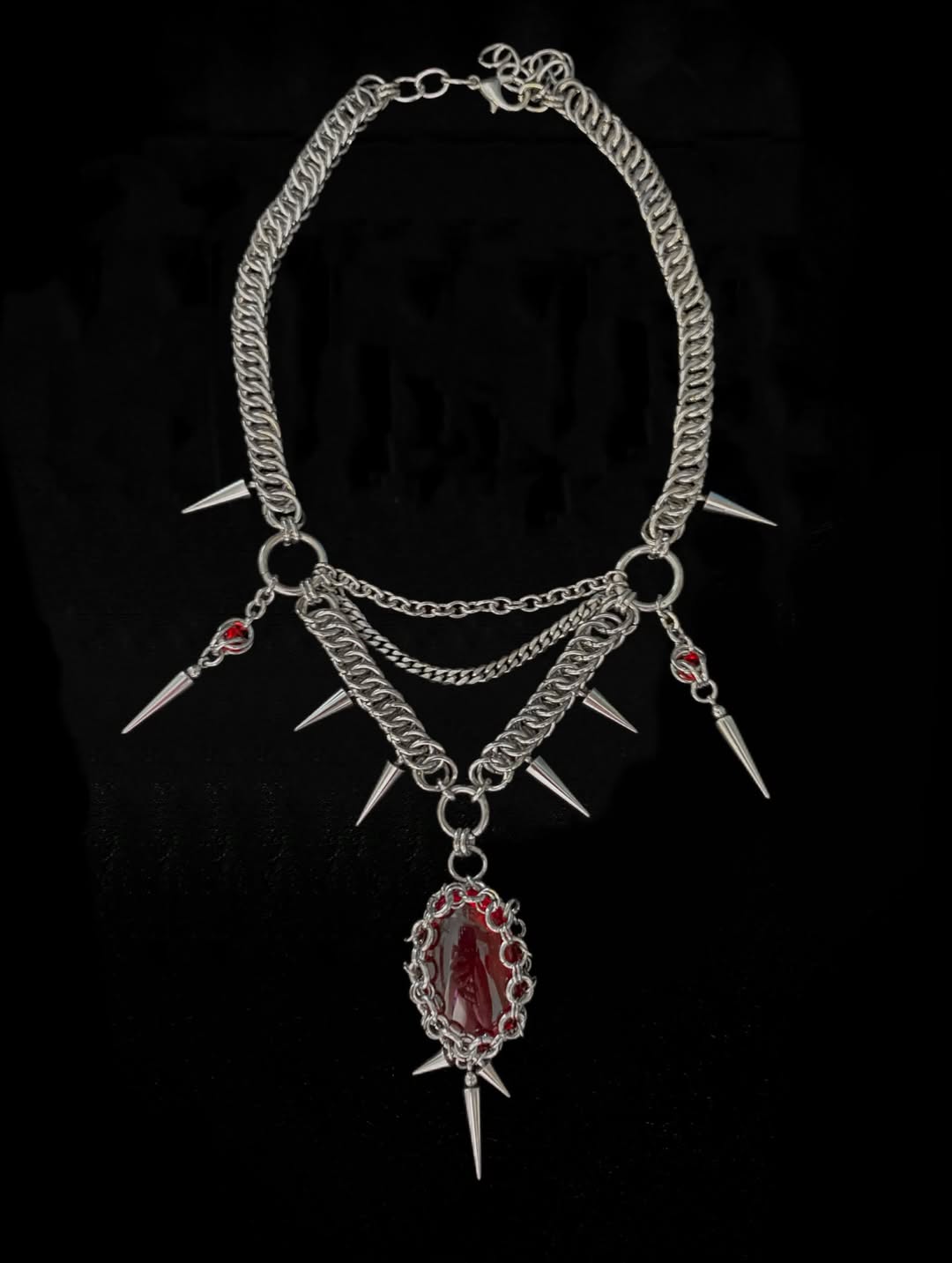 Crafted entirely by hand, the piece features layered stainless steel chainmail, sharp metal spikes, and a striking blood red stone pendant suspended at the center.