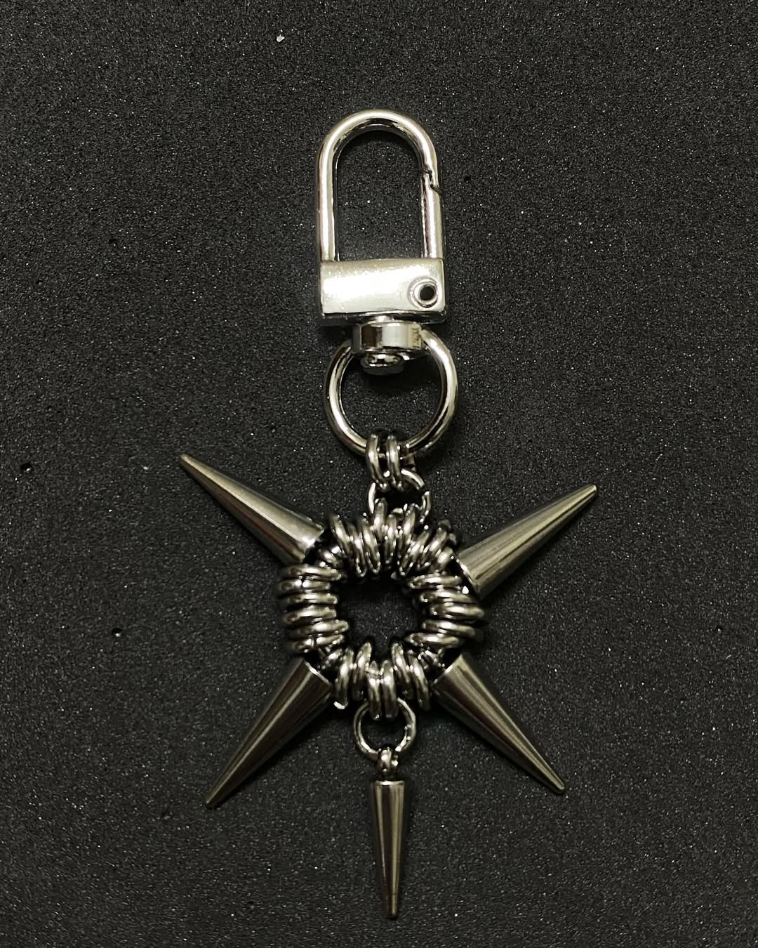 This keychain features a circular chainmail core reinforced with sharp steel spikes, forming a star-like silhouette that symbolizes strength, protection, and rebellion. Finished with a durable swivel clasp, it can be securely attached to keys, bags, belts, or backpacks—designed for both everyday use and statement styling.