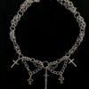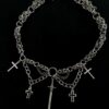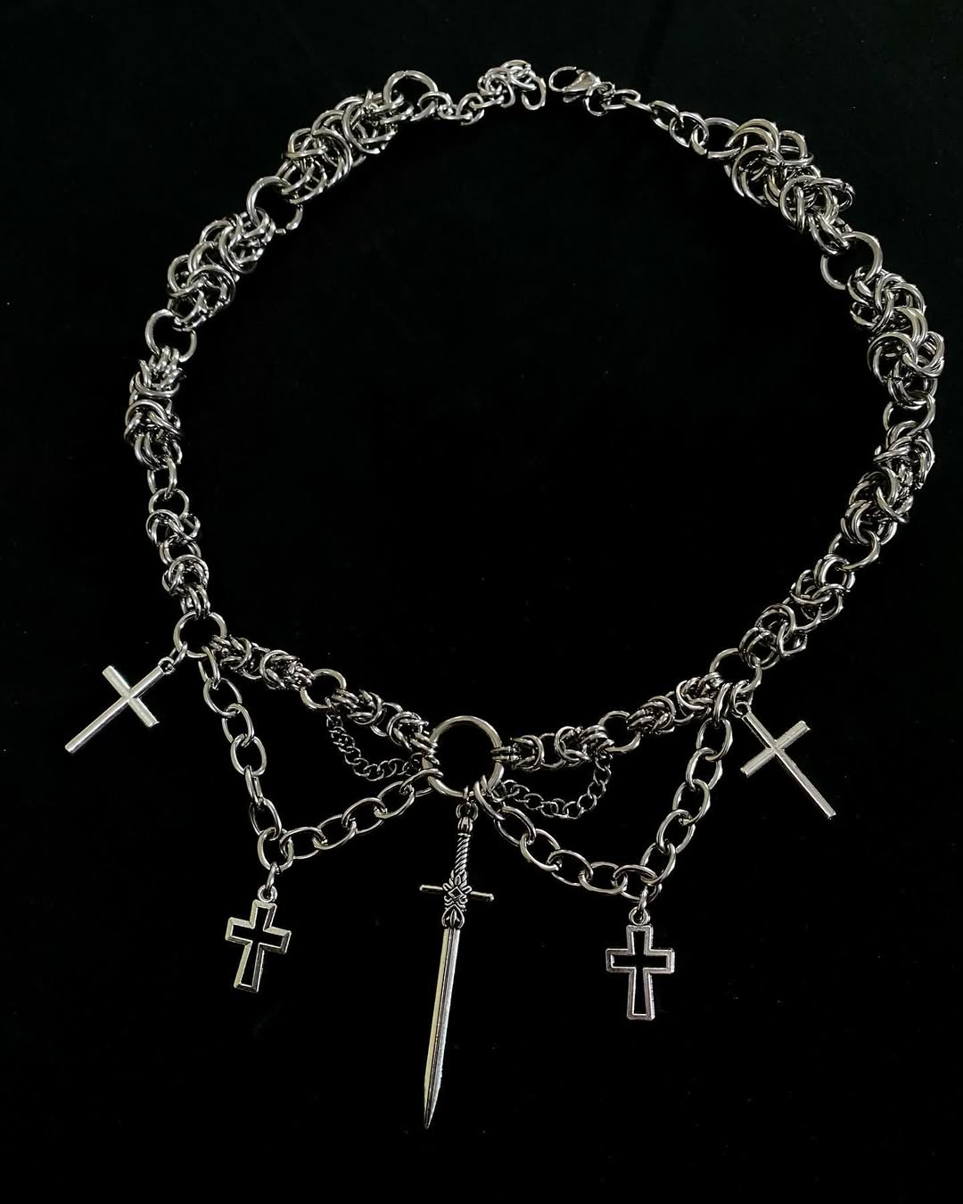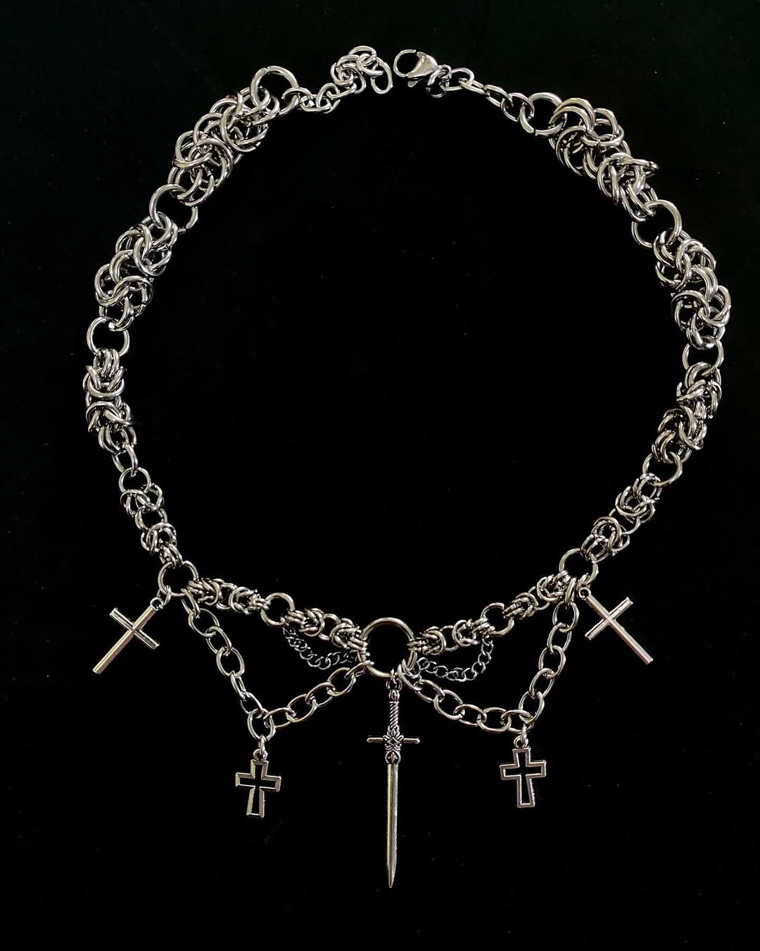 The necklace combines interlinked chainmail texture with dangling crosses and a sword charm, giving it a powerful, dark, and rebellious look.