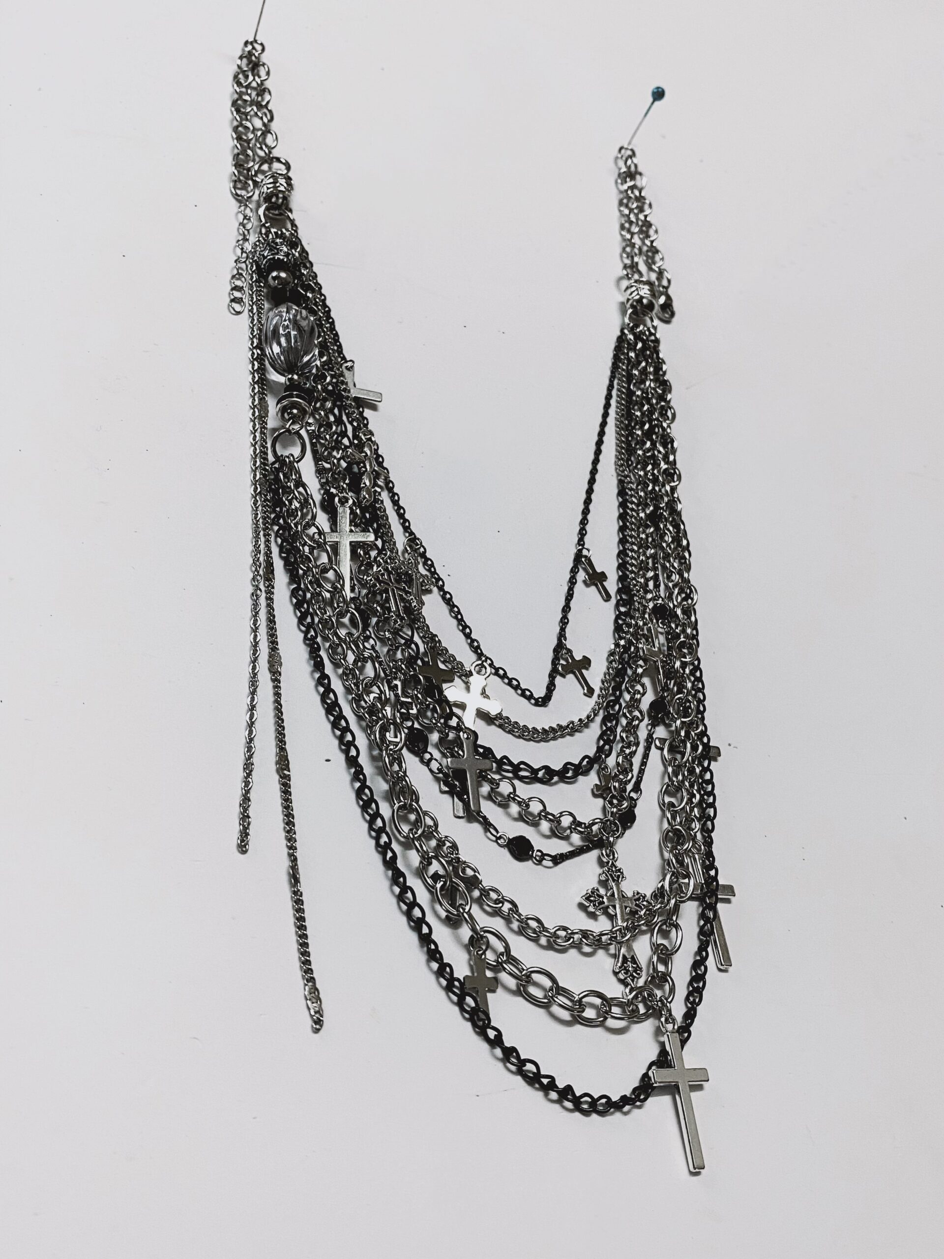The combination of silver-tone metal chains and religious cross symbols reflects classic gothic influences — cathedral imagery, medieval faith, and underground subculture — reimagined through modern handmade craftsmanship.
