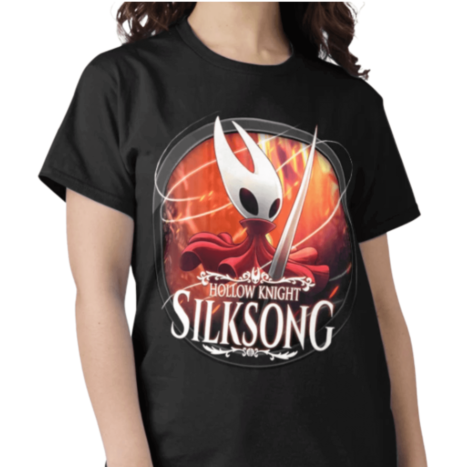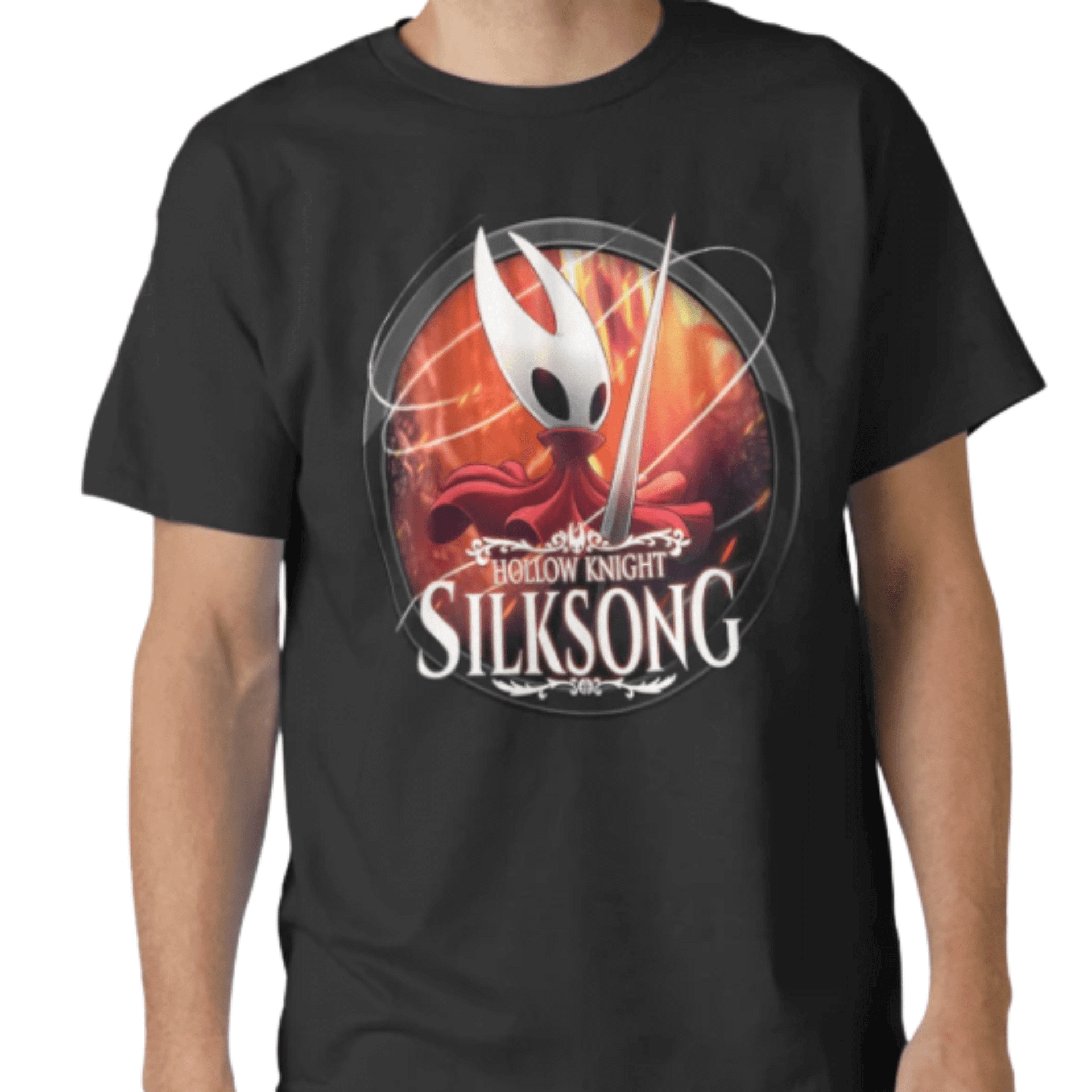 The Hollow Knight Silksong Classic T-Shirt is a must-have for fans of the iconic game series. Featuring a striking design with the beloved Hollow Knight character adorned in a vibrant red cape, this t-shirt showcases a dynamic circular graphic with a sword and fiery background, capturing the essence of the upcoming Silksong adventure. Crafted from high-quality black cotton, this classic tee offers a comfortable fit and durable construction, perfect for everyday wear or gaming sessions. The bold “Hollow Knight Silksong” text adds a touch of authenticity, making it a standout piece for enthusiasts and collectors alike.