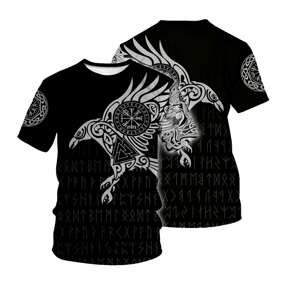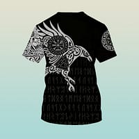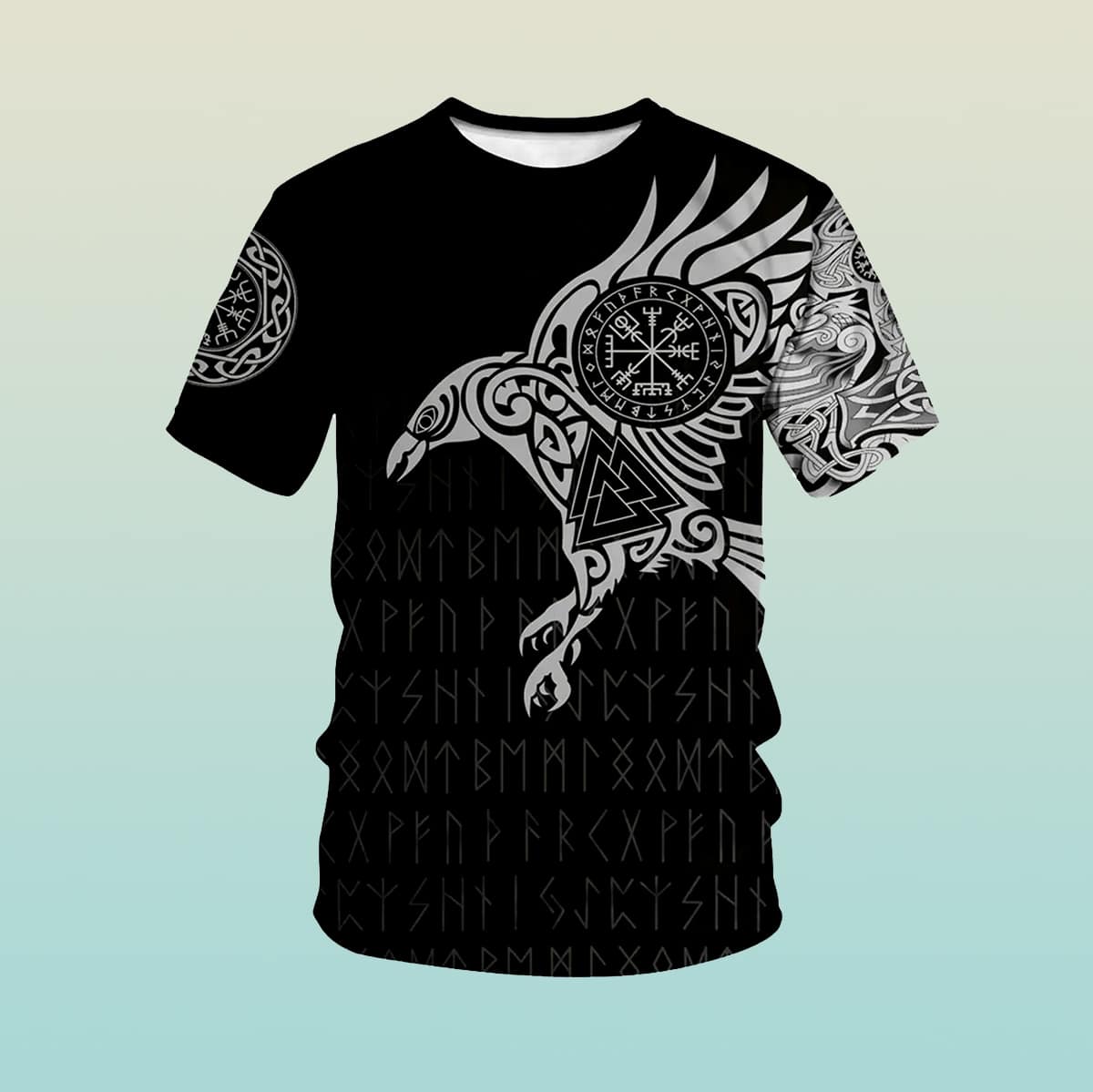 We are pleased to introduce our new “Odin’s Compass Viking Rune” t-shirt, inspired by Norse mythology and Viking culture. This shirt features an intricate design centered around a raven, the faithful messenger of Odin. Surrounding the raven are various Norse runes representing the magical symbols so important to the Vikings.