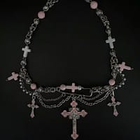 Embrace the softer side of gothic fashion with this handcrafted Pastel Pink Gothic Layered Necklace, a perfect fusion of dark aesthetic and dreamy pastel tones. Designed for alternative fashion lovers, this piece blends chainmail-inspired links, multiple pink cross charms, layered silver chains, and a striking safety pin centerpiece, creating a unique balance between cute, rebellious, and gothic elegance.