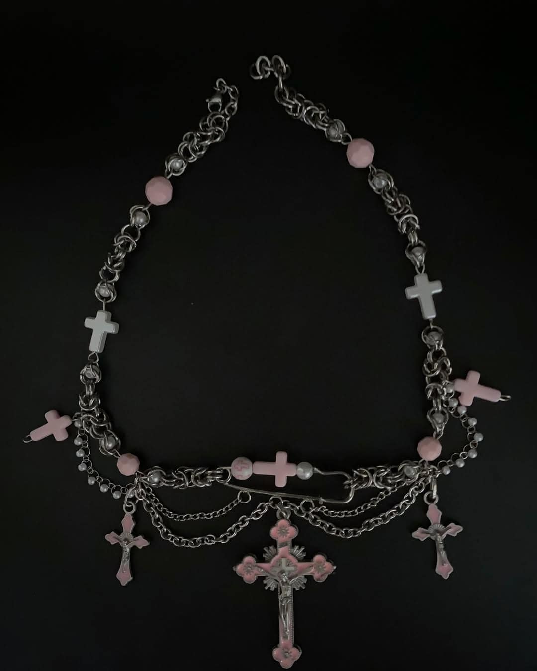 Embrace the softer side of gothic fashion with this handcrafted Pastel Pink Gothic Layered Necklace, a perfect fusion of dark aesthetic and dreamy pastel tones. Designed for alternative fashion lovers, this piece blends chainmail-inspired links, multiple pink cross charms, layered silver chains, and a striking safety pin centerpiece, creating a unique balance between cute, rebellious, and gothic elegance.