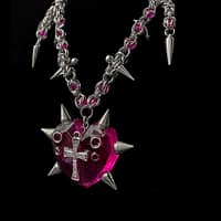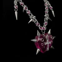Featuring a translucent pink heart-shaped resin pendant reinforced with metal spikes and a vertical bar emblem, this necklace blends romantic color with raw industrial energy.