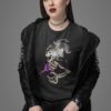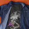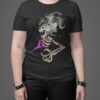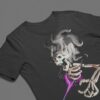 This spooky skeleton t-shirt is the perfect addition to any Halloween costume or horror movie fan’s wardrobe. Featuring a bold graphic print of a smiling skeleton wearing a flowing purple cape, this black tee will attract compliments wherever you wear it. Standing amidst tombstones in an eerie graveyard scene, the skeleton embodies the ghoulish spirit of Halloween. As part of our special collection, this limited edition t-shirt is designed for those who celebrate the macabre all year round. Lightweight and comfortable, it can easily be paired with jeans or pants for a casual yet creepy look. Add some fake blood stains or other Halloween accessories to complete the chilling vibe. This fun and unique t-shirt is sure to be a favorite haunted holiday shirt or conversation starter at any event.