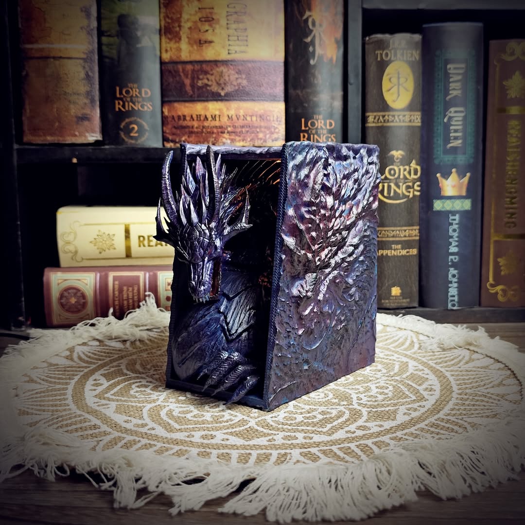 This handcrafted Dragon Book Nook captures the moment a primordial dragon awakens from the abyss – its obsidian scales forged by darkness, its wings folded like living shadows between ancient tomes. Subtle inner lighting casts a warm, ember-like glow, creating the illusion of a hidden realm breathing quietly within your bookshelf.
