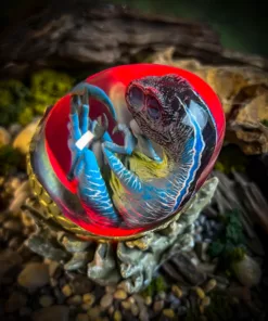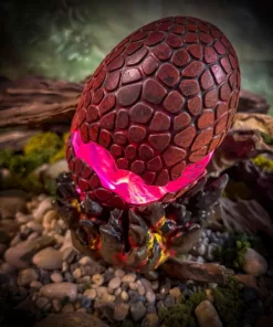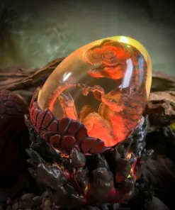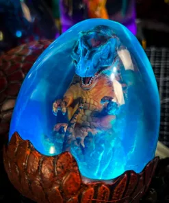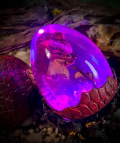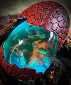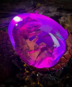 The Tyrannosaurus Rex Hatchlight is a unique decorative lamp that embodies a prehistoric aesthetic, perfect for dinosaur enthusiasts and art lovers alike. Designed to resemble a T-Rex hatching from its egg, the product features a transparent shell that encases the dinosaur, creating a warm, mystical lighting effect. The glowing amber-red light mimics the vivid appearance of a real dinosaur egg, set on a natural stone base. More than just a lamp, the Hatchlight is a piece of art, ideal for enhancing living spaces, bedrooms, or as a distinctive gift for special occasions. The Tyrannosaurus Rex Hatchlight is sure to captivate anyone looking to bring a touch of prehistoric wonder into the modern world.