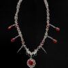 At its heart sits a dramatic pair of sculpted metallic bat wings, spreading wide to cradle a deep blood-red faceted gemstone — a single, mesmerizing “drop of blood” that catches and reflects light like fresh crimson on moonlight. Delicate teardrop red crystals dangle beneath, swaying with every movement for an ethereal, almost hypnotic effect. Surrounding the centerpiece, intricate handmade chainmail weaves dozens of premium stainless-steel rings into a flexible, armor-like collar that feels both medieval and dangerously modern. Sharp spiked charms punctuate the design, adding just the right touch of menace.
