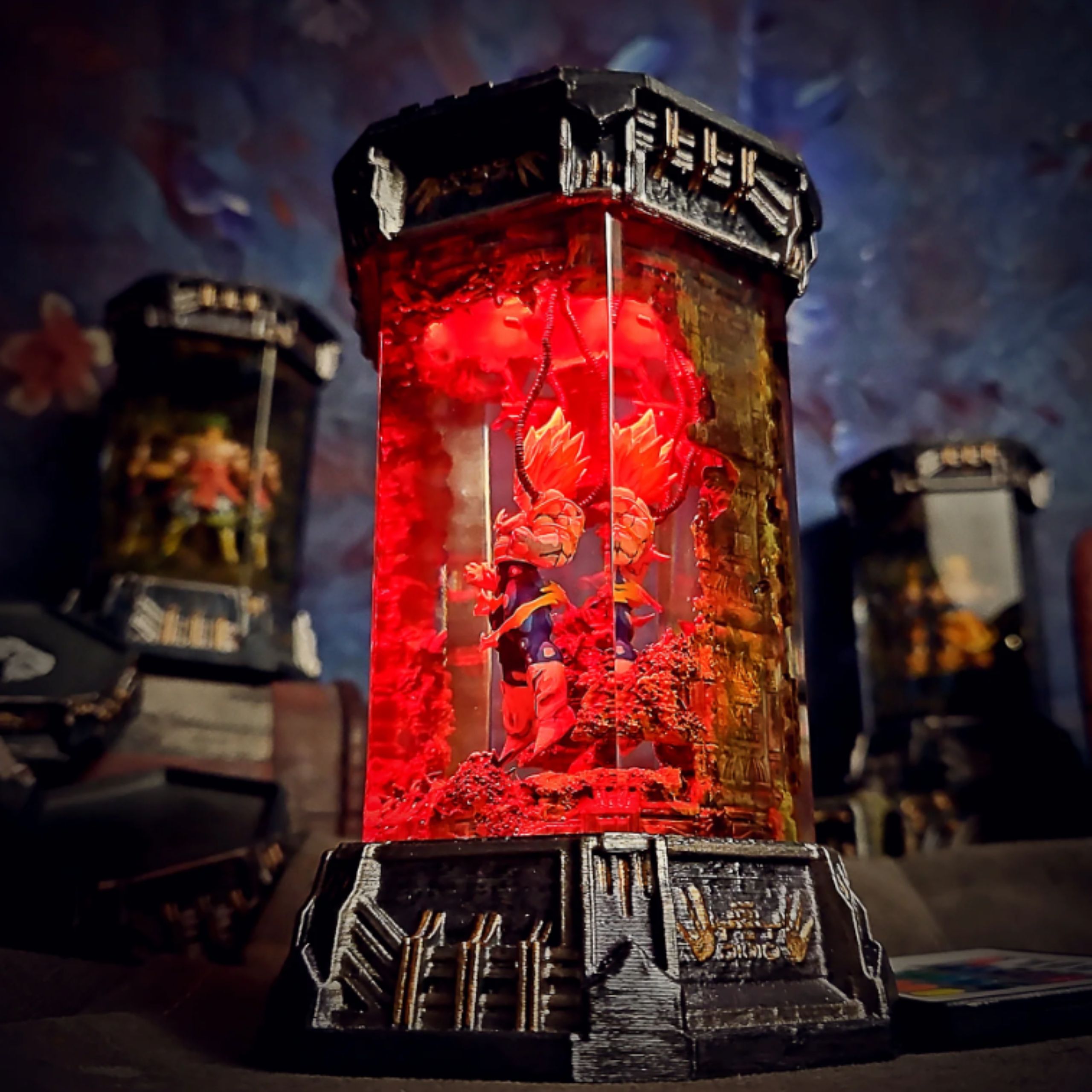 Building Depth and Dimension: To ground the scene and introduce a tactical, battlefield vibe, place hexagonal black coasters or minimalist game boards at the base of the display. In the background, subtle wooden shelving or a dark, textured fabric can frame the setup perfectly. The vertical forms of the lamps will naturally draw the eye upward, mimicking the awe-inspiring sight of ascending ki energy.