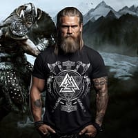 This T-shirt features graphics heavily inspired by Norse mythology such as Vikings, Valhalla, skulls, axes and 3D rune designs on a distressed/vintage fabric for a more authentic vintage feel.
