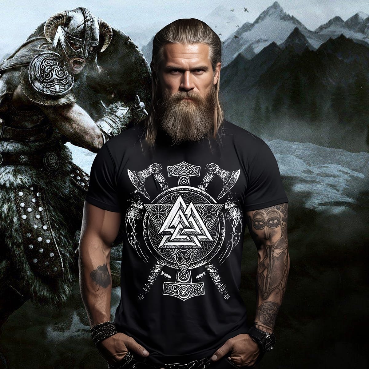 It depicts important figures like Odin and brave warriors in battle. Made from stretchy comfortable material, it combines the contemporary streetwear fashion style.